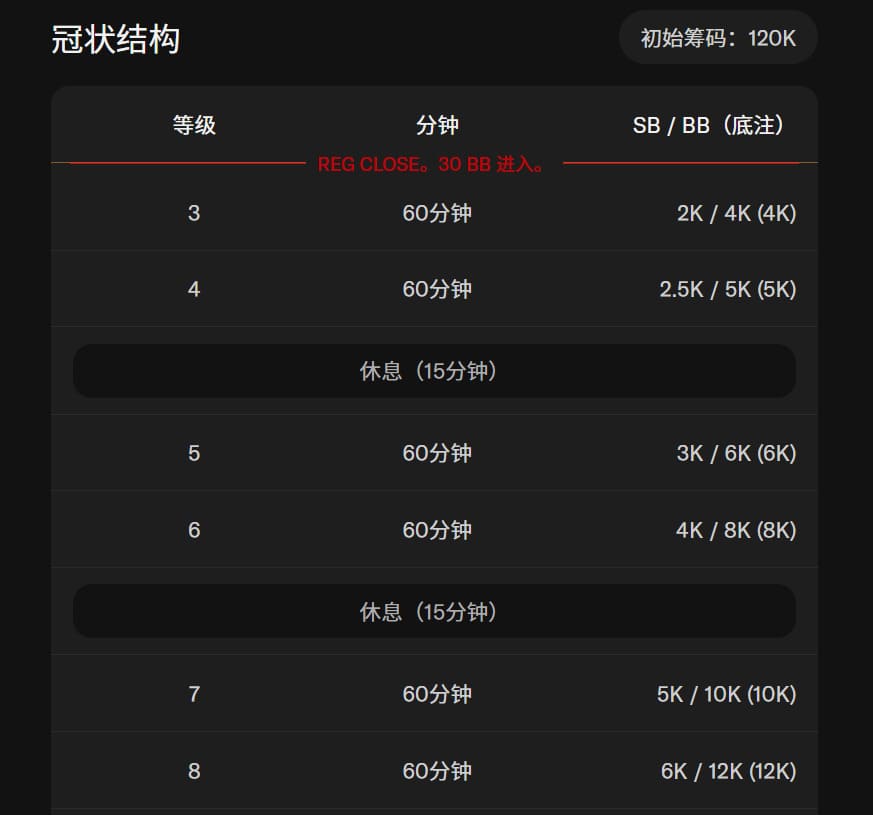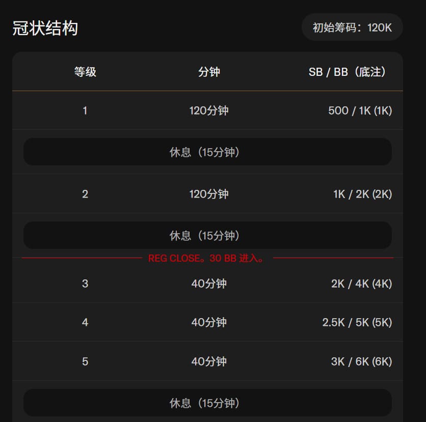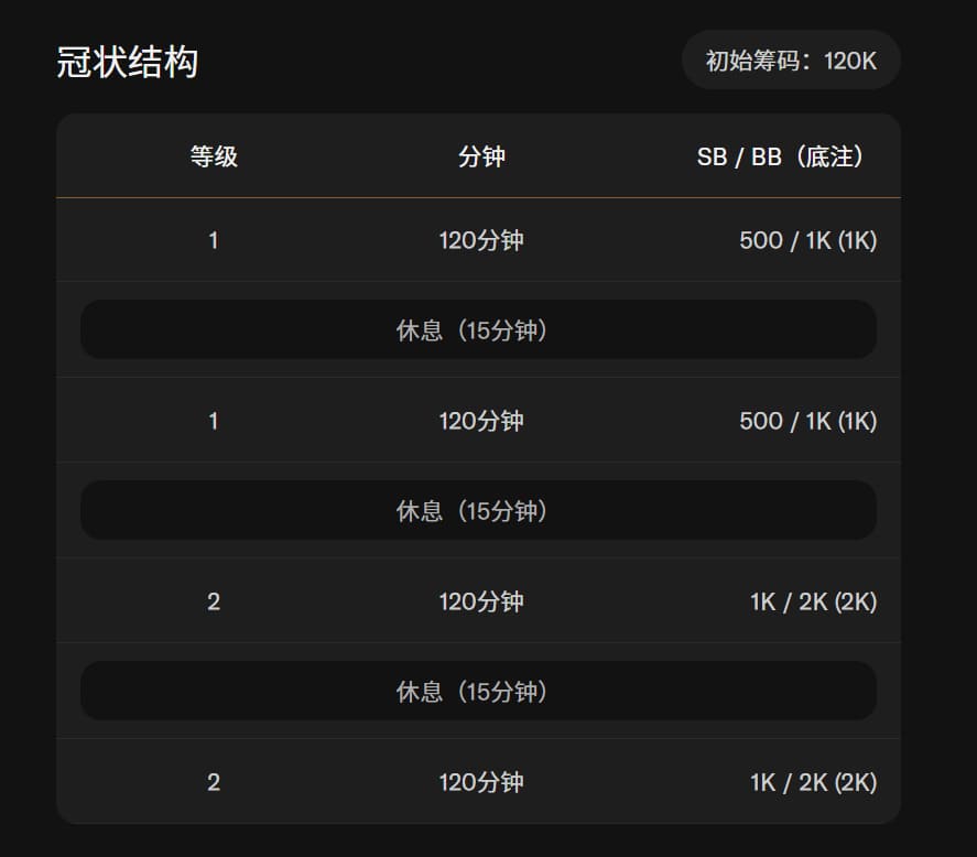 起始筹码120K,各个小组的升盲结构各有差异,给各类玩家多元的选择。