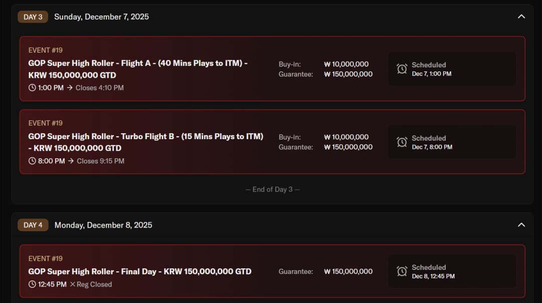 整个系列赛诸神扑克安排了五场中额(1百万韩币左右)两日赛,如下表所示。