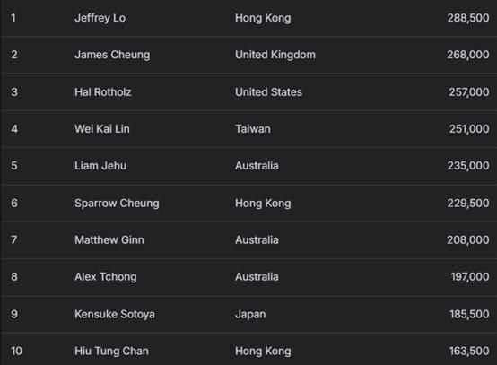 澳大利亚选手Liam Jehu(235,000)位列第五,Natural8代言人Sparrow Cheung同样表现亮眼,以229,500记分牌量跻身前十。