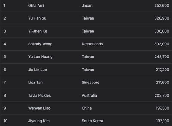 虽然只有Hollink与Mateo两人的码量破三百万,但最受人注目的,当属记分牌排名第三的Kitty Kuo。