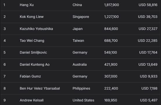 新加坡选手Kok Kong Liew以出色表现获得亚军,收获1,227,100新台币(39,703美元)奖金;日本选手Kazuhiko Yotsushika则夺得季军,将844,600新台币(27,327美元)收入囊中。