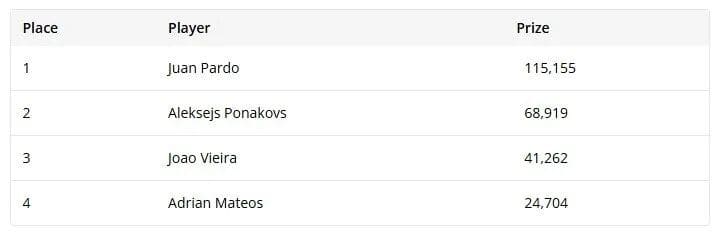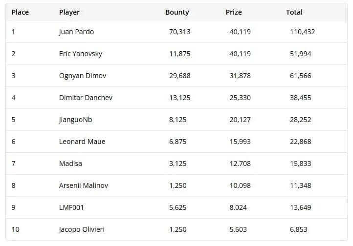 Pardo一举淘汰6名对手,光赏金就斩获了72,500刀,最终他击败“GREAGYPoker”夺冠,总计拿下125,591刀。