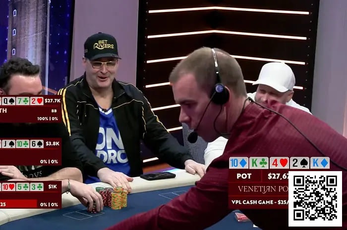 尽管持有最佳牌,Hellmuth在面对两位对手强大的听牌时,胜率仅为39%。但这一次并未出现Hellmuth标志性的情绪爆发,而是迎来了他的庆祝时刻——河牌K♦落下,使他组成四条,成功收下27,675的底池。他高呼:“这全他X的是技术,兄弟们!”