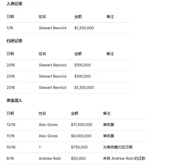 此外,账本显示Goldstein在2016年10月对阵未具名对手时赢得75万美元,并列出其从加州亿万富翁Stewart Resnick处获得及归还的资金记录——Resnick曾为其提供1000万美元扑克信用额度。