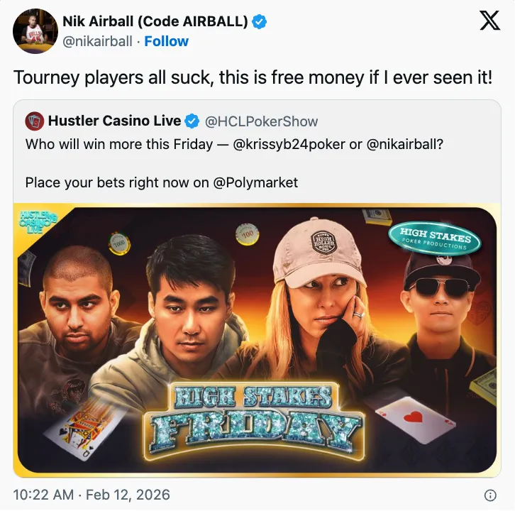 这位自称“洛杉矶之王”的Nik Airball,即将登陆HCL直播桌,和这对扑克神仙夫妻及其他选手一起游戏。他嘴炮拉满,整个扑克圈都在看,他能不能兑现自己的狂言。