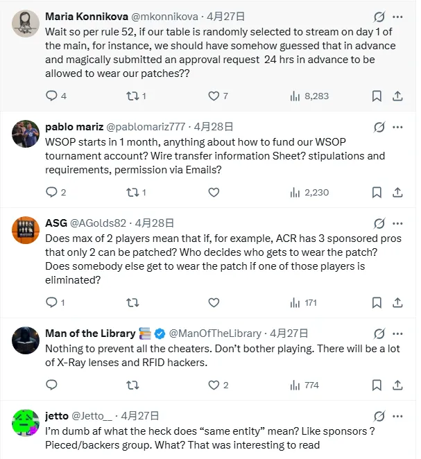 “如果同一张直播桌有3个来自同一实体的选手,其中一人不得不摘标。那这个人会不会因此违反与赞助商的合同?或者WSOP会直接把人调到另一桌?那也会产生奇怪的冲突。”